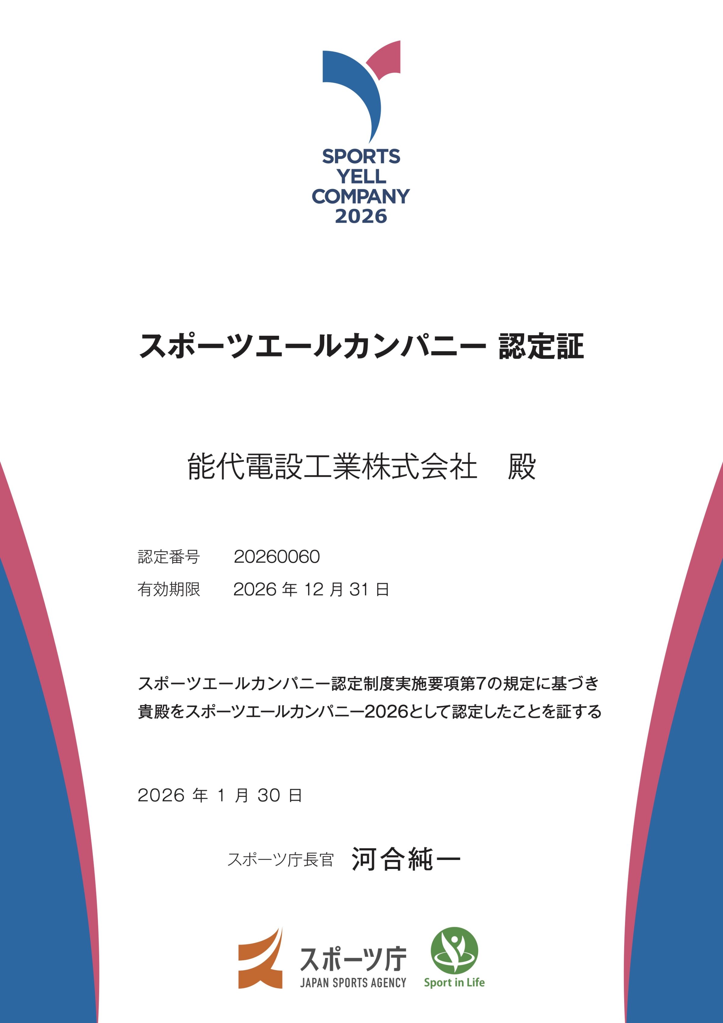 この度、能代電設工業は、従業員の健康増進のためにスポーツ活動の促進に積極的に取り組む企業として、スポーツ庁より「スポーツエールカンパニー2026」に認定されました。